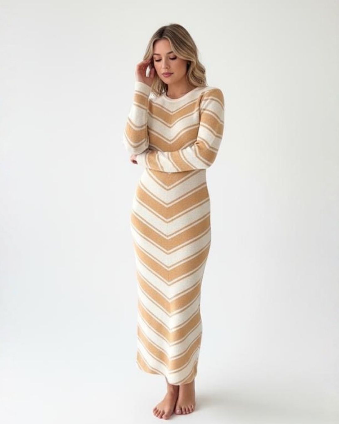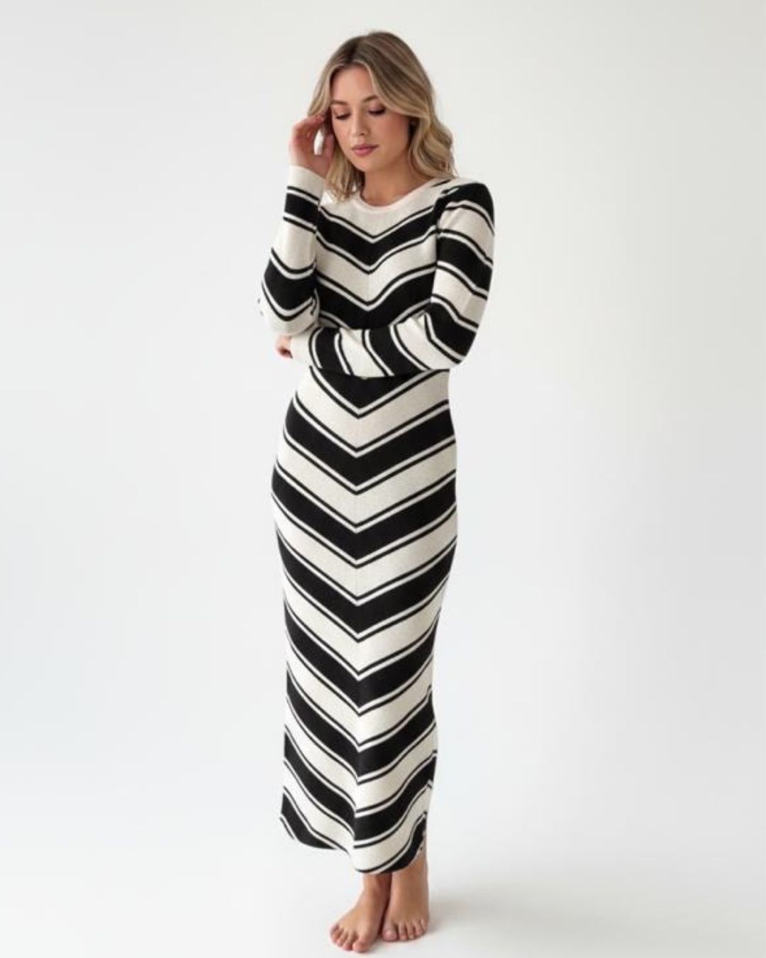 Este vestido de punto largo combina un diseño de rayas en “V” que estiliza la figura y aporta un aire moderno y elegante. Su tejido suave y elástico se ajusta cómodamente al cuerpo, realzando la silueta sin sacrificar confort. Las mangas largas equilibran su corte minimalista, ideal para días frescos. Perfecto para eventos casuales o una salida urbana con estilo. Su contraste de colores lo convierte en una prenda versátil y atemporal.